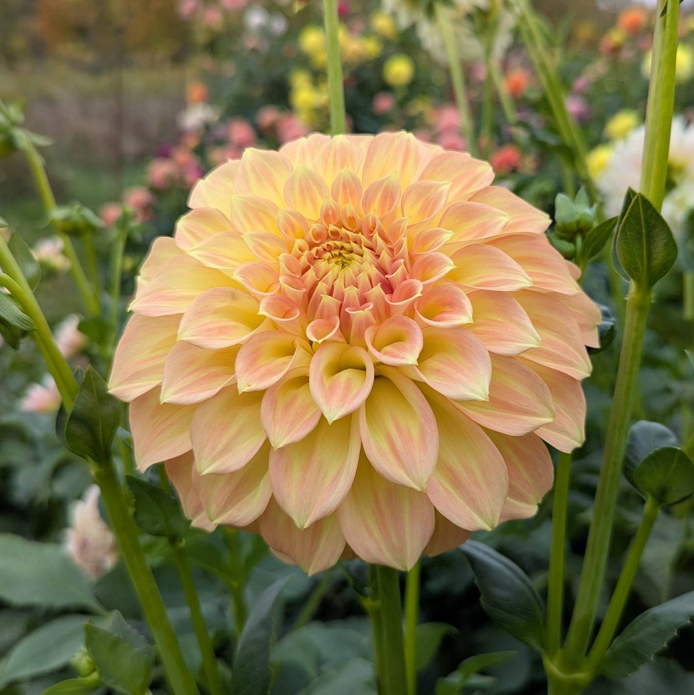 These splendid medium-sized blooms with slightly curvy and pointed petals, borne atop tall, sturdy stems present one of the most glorious dahlia varieties grown. Bracken Sarah, in a softer undertone of apricot, peach, and creamy yellow makes it a more versatile choice for multiple color themes of many growers’ dreams. One of the most pursued after in the Bracken series, these formal decorative blooms are remarkable in floral displays.