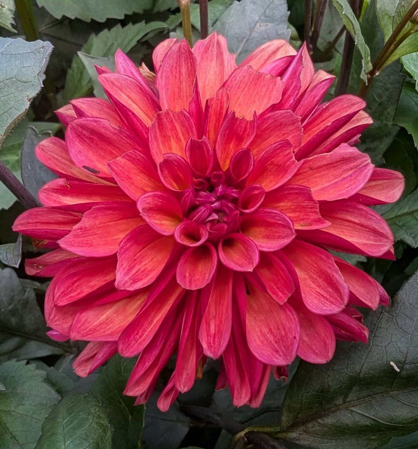 Glowing blooms in rusty red, salmon pink, and orange, adding high contrast against its dark purple foliage Groovy is a head-turning, unique bloom. It is a reliable producer of flowers and tubers alike, and one of the earliest dahlias to bloom in my garden! The stems are long and sturdy, bearing these strikingly beautiful and plentiful blooms.