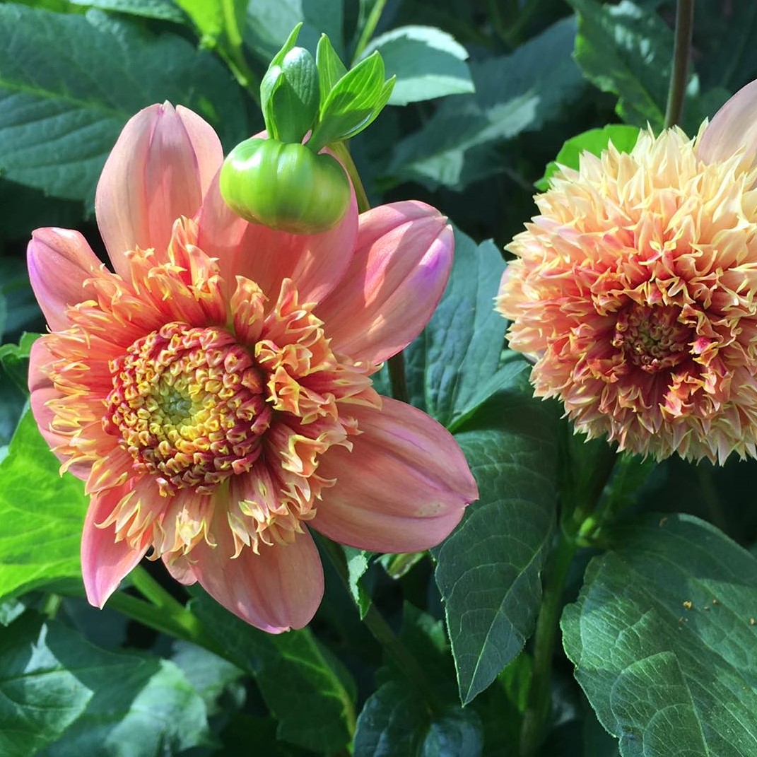 Sandia Brocade is simply beautiful in their rare golden, bronze, peach coloring. Outer petals in cantaloupe peach reflex backwards as the blooms mature and the golden puffy center with tubular fringed petals is the most prominent, even after the outer petals have fallen off. These golden, bronze, peachy blooms are amazing as blenders and fillers in flower arrangements. Floriferous bloomer and prolific tuber-maker that overwinters well.